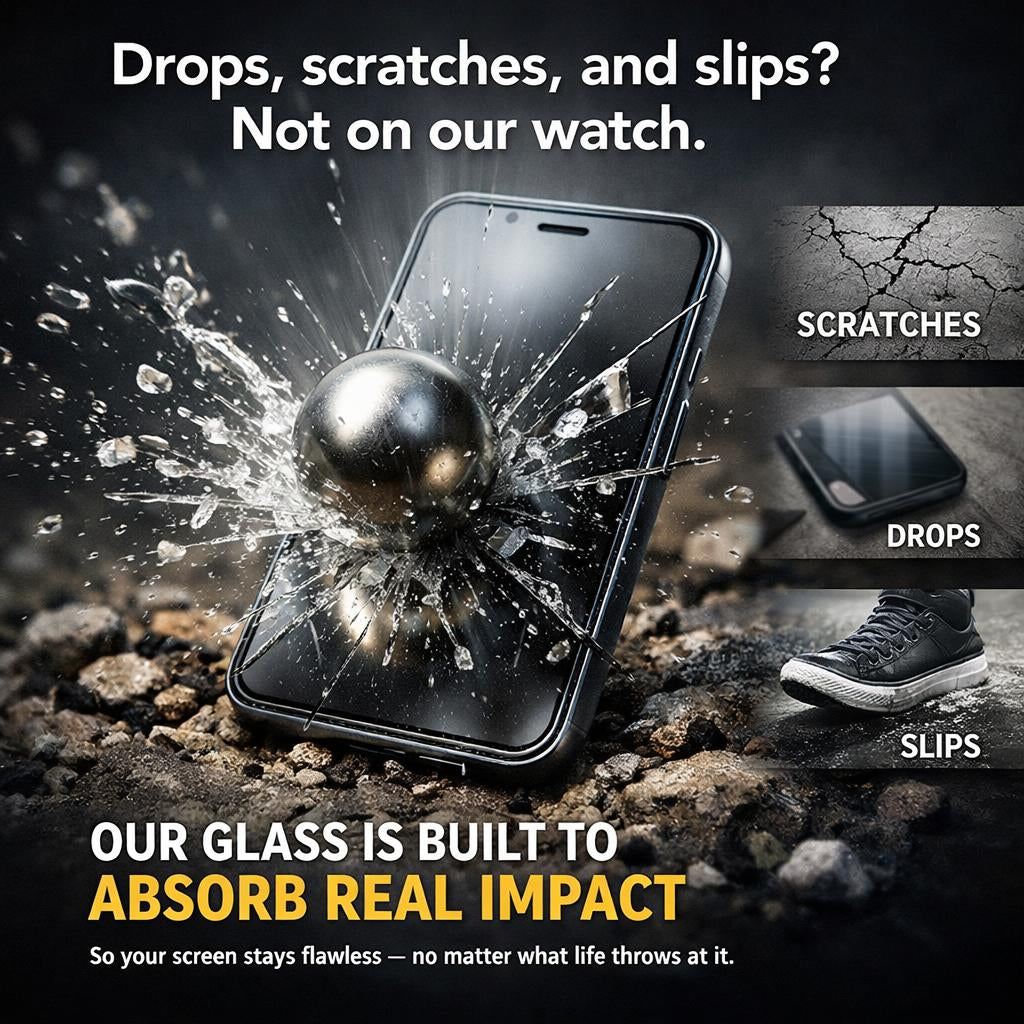Our glass is built to absorb real impact so your screen stays flawless — no matter what life throws at it.